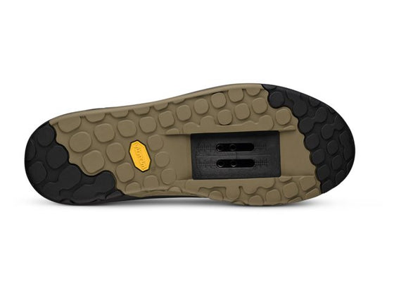 A low-profile tapered tread pattern positioned at the mid-foot allows for an immediate connection and optimal mechanical interface with the pedal pins, while under the heel and toes, a deeper, sharper tread provides better ground traction when hiking back up the hill.