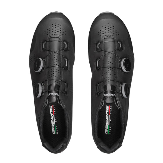 The G. OBSIDIAN cycling shoes from GAERNE are particularly at home on gravel. With a medium stiffness of 8 on the GAERNE scale, they offer pleasant flexibility without compromising on performance thanks to the carbon-nylon mix in the EPS CARBON POWER SOLE 8.0. The clever AIR VENTILATION SYSTEM of the Italian manufacturer provides additional ventilation, which will benefit you on warm summer days. Thanks to the double BOA L6 dial, you can adjust these bike shoes to fit perfectly even using just one hand. These XC shoes are made for your regular dose of adventure.